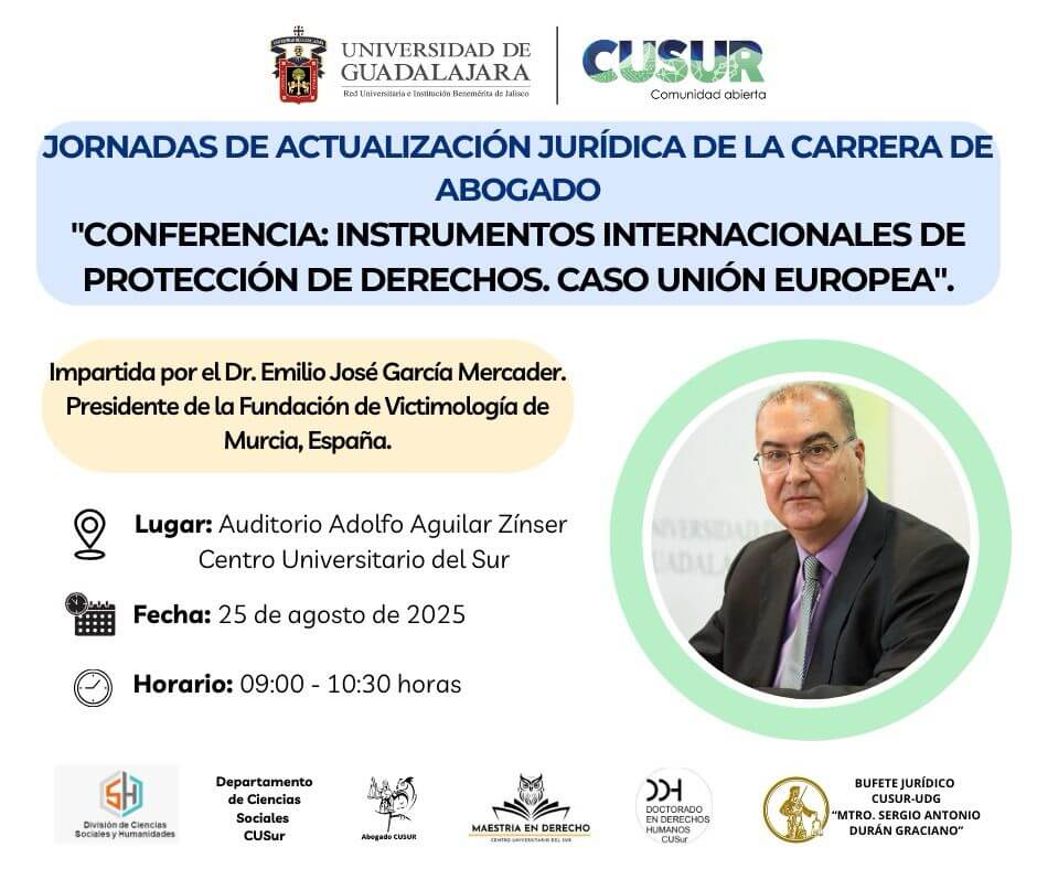 Participación de la Fundación de Victimología en las «Jornadas de actualización Jurídica del Programa Educativo de Abogado», en el Centro Universitario del Sur (Cusur), de la Universidad de Guadalajara de México. La intervención de Emilio José García Mercader trató sobre ·Instrumentos internacionales de protección de derechos en la Unión Europea».